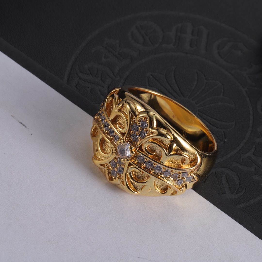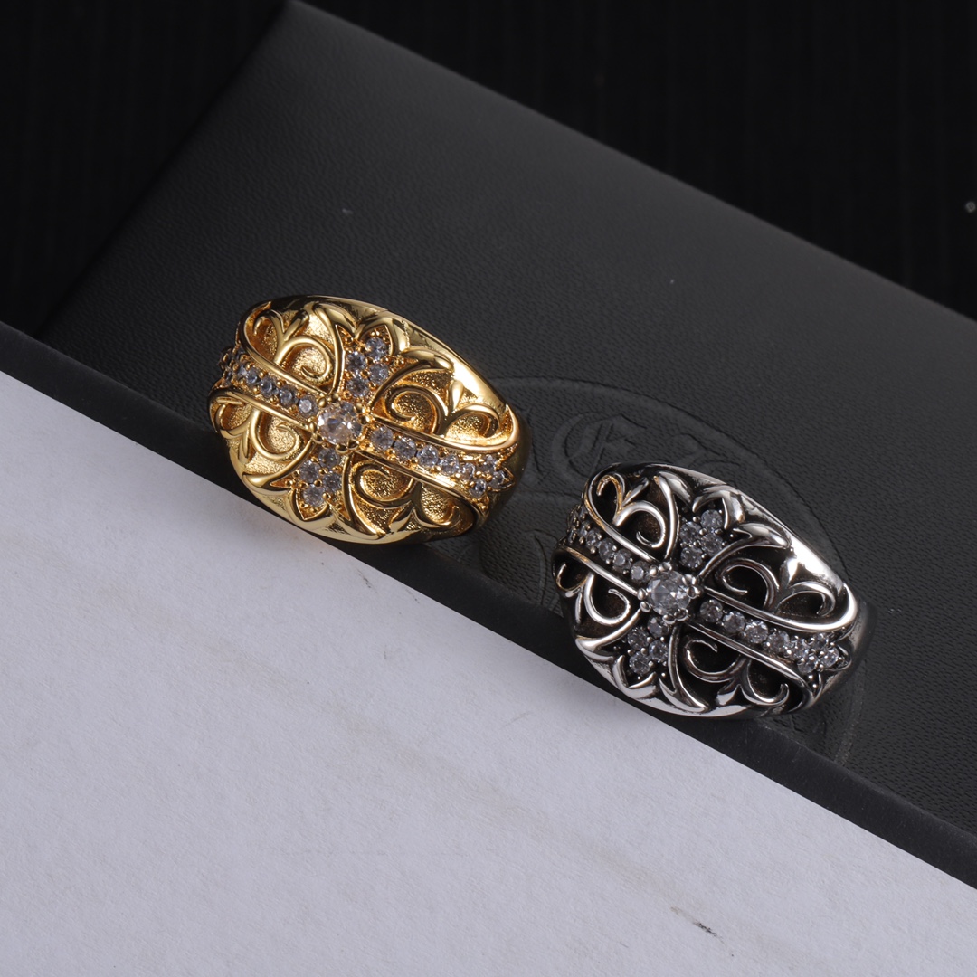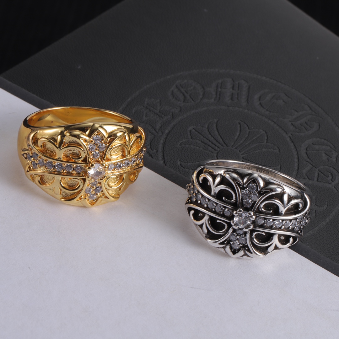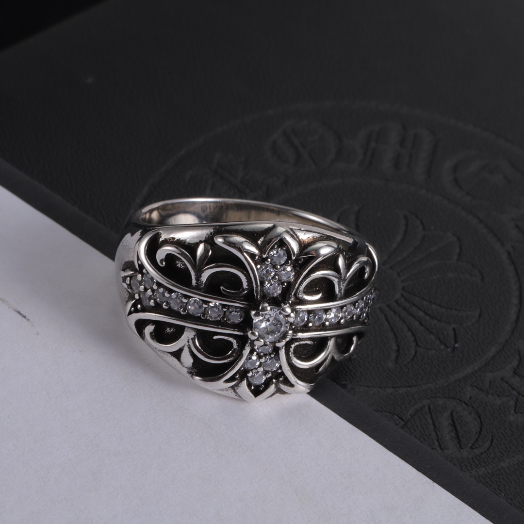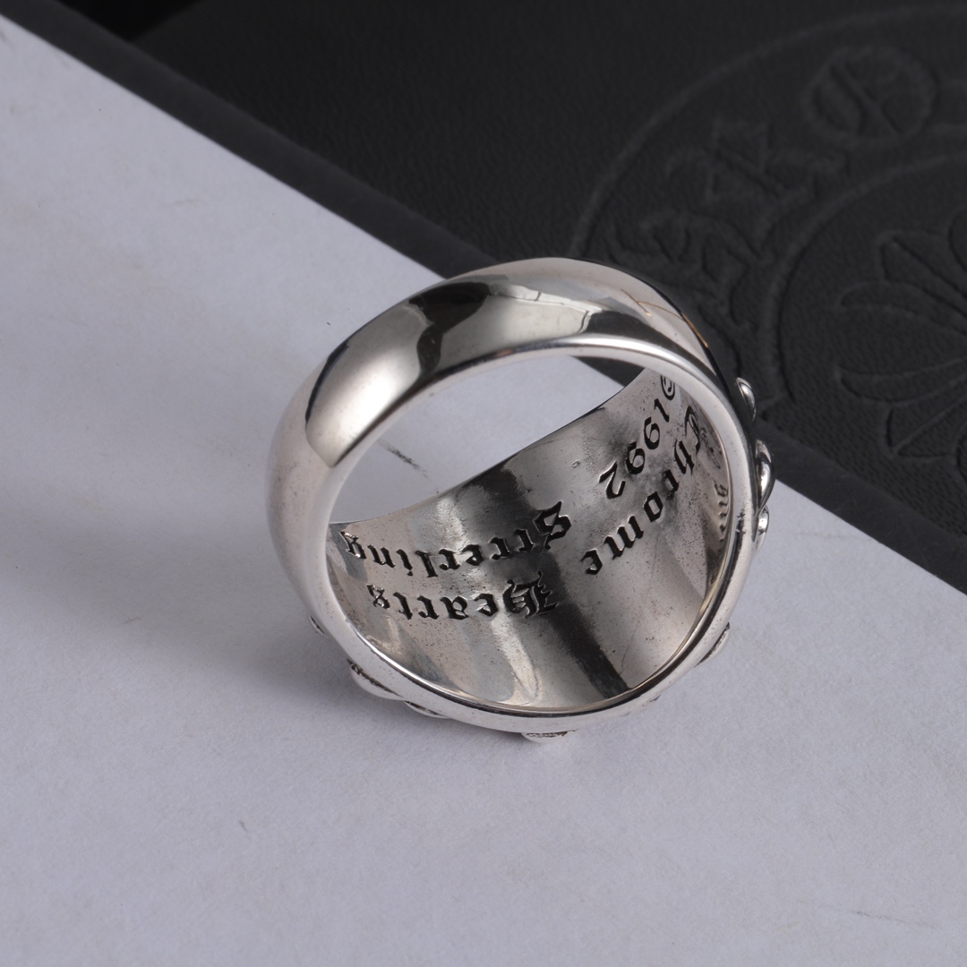 Classic Chrome Hearts style ring, crafted with delicate electroplating for vintage distressed texture, featuring iconic cross/scout flower carvings with bold lines and strong gothic vibe. Available in sizes 6-11#, unisex design, perfect for daily wear or stacking to show your attitude.